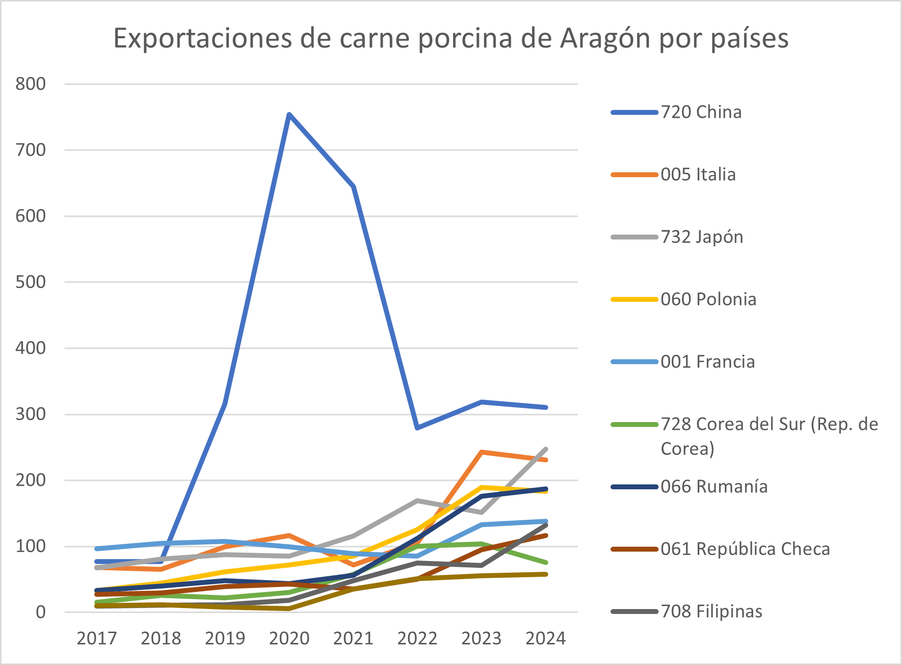 China es el principal destino de las exportaciones aragonesas de carne porcina, con un volumen de más de 300 millones de euros en 2024, el 1,8% de las exportaciones aragonesas. Aragón es la segunda Comunidad Autónoma con más exportaciones de cárnico a China, solo por detrás de Cataluña. A nivel nacional, Aragón supone el 33% del total de las exportaciones del sector. Durante la epidemia de peste porcina africana, las exportaciones aragonesas de porcino a China se dispararon.