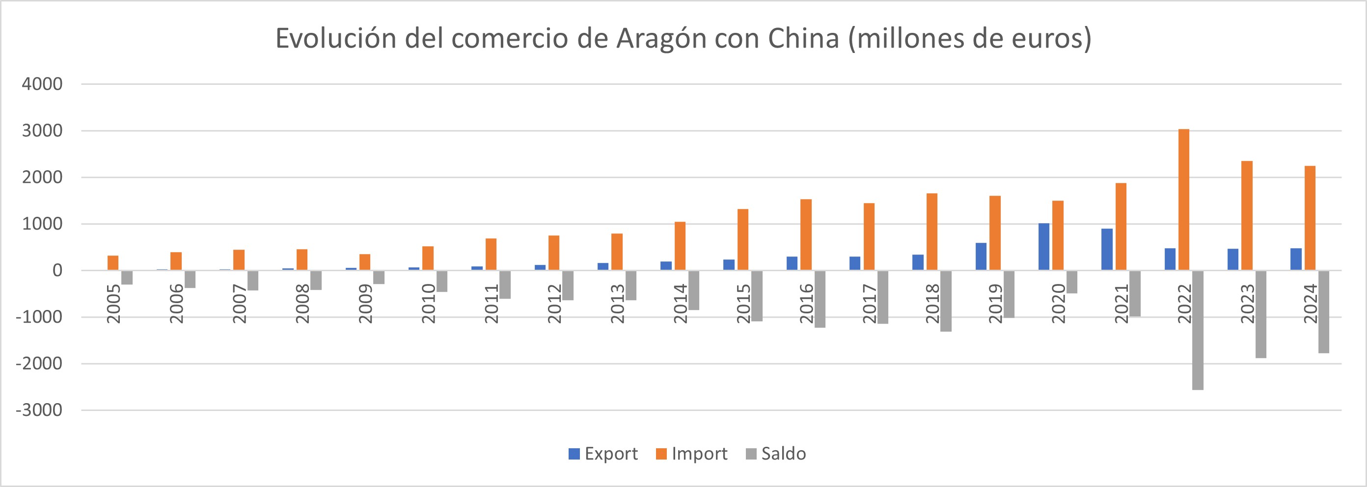 China es el uno de los principales socios comerciales de Aragón, con un volumen de intercambio de bienes de más de 2.700 millones de euros en 2024. Es el segundo proveedor (importaciones) de Aragón en valor (después de Francia) con 2.251,81 millones de € en 2024 y el octavo destino de nuestras exportaciones (475,91 millones de € en 2024), con un incremento notable en los últimos años.
