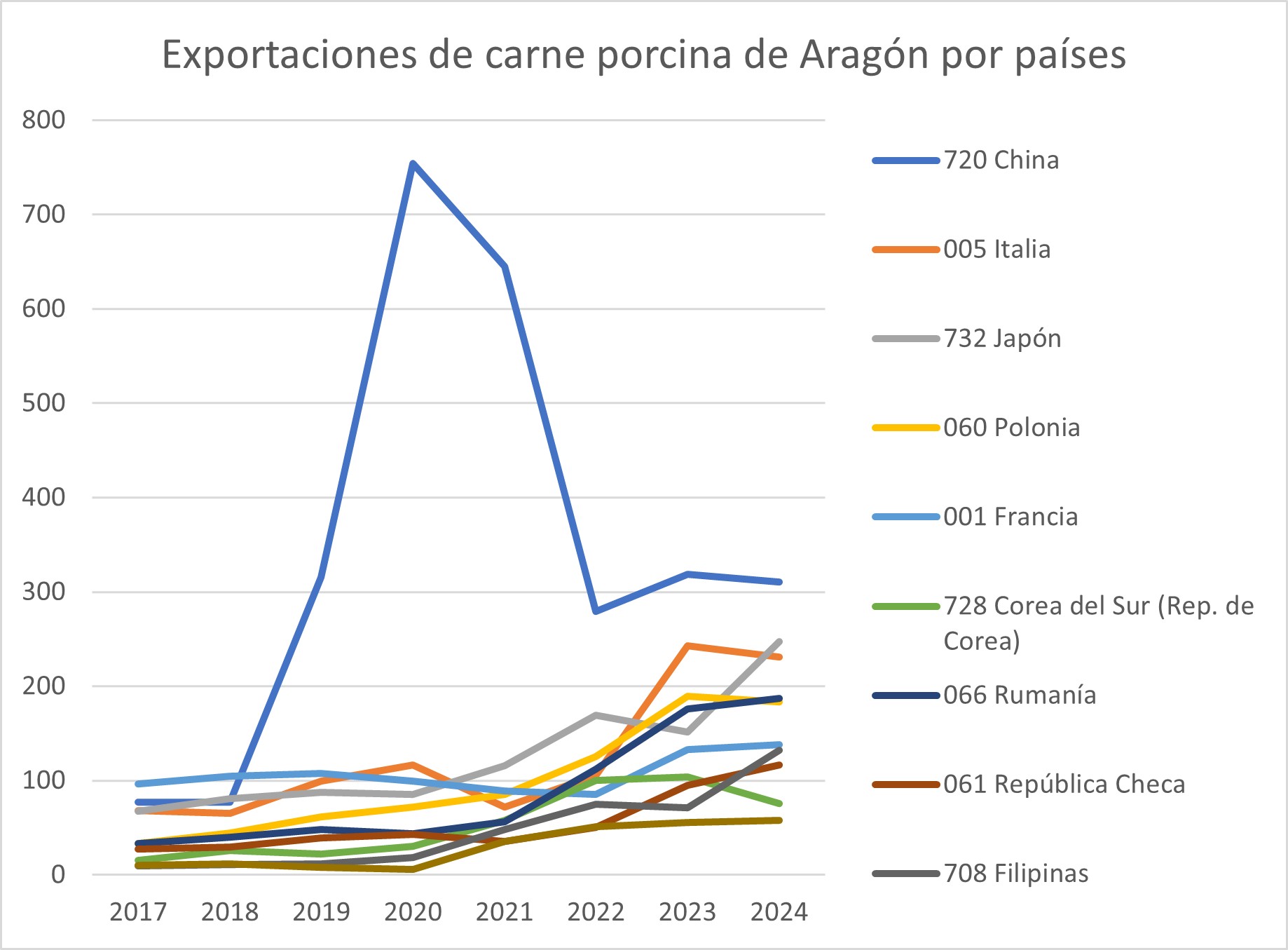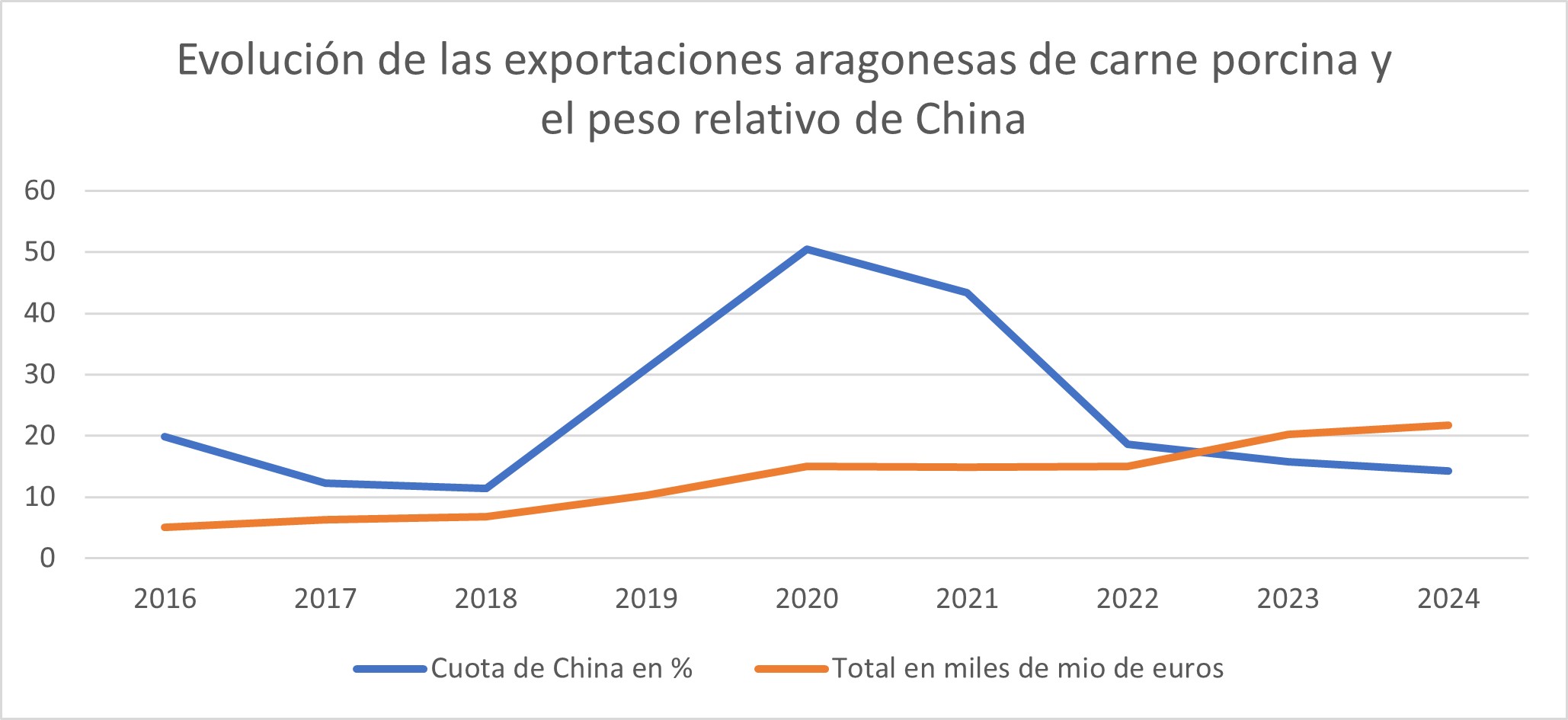 Durante la epidemia de peste porcina africana, las exportaciones aragonesas de porcino a China se dispararon. Tras el primer brote, detectado en agosto de 2018, se extendió rápidamente por todo el país. La epidemia paralizó la producción de carne en el país asiático, obligando al sacrificio de cientos de miles de cerdos. El último brote fue detectado en febrero de 2023. Para satisfacer la demanda de su población, tradicionalmente consumidora de porcino, el Gobierno chino recurrió a las importaciones, y las empresas aragonesas supieron aprovechar el momento, escalando la producción en tiempo récord. Entre 2017 y 2020, las exportaciones porcinas de Aragón a China se multiplicaron por diez y en 2020, uno de cada dos kilos de carne exportados salió rumbo a China.