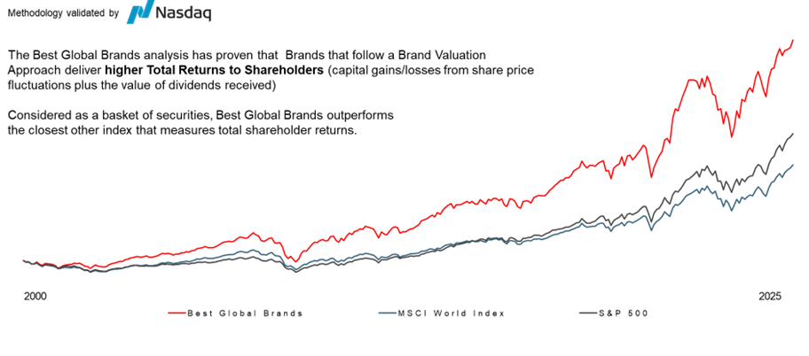 La consultora Interbrand ha monitoreado esta cadena durante los últimos 25 años a través del ranking anual de las marcas más valiosas del mundo, Best Global Brands. Si miramos esta lista como una cesta de acciones, las marcas mejor gestionadas han generado un mayor rendimiento a los accionistas que otros índices con perfiles de riesgo similares. El siguiente gráfico muestra el desempeño relativo de los principales índices: