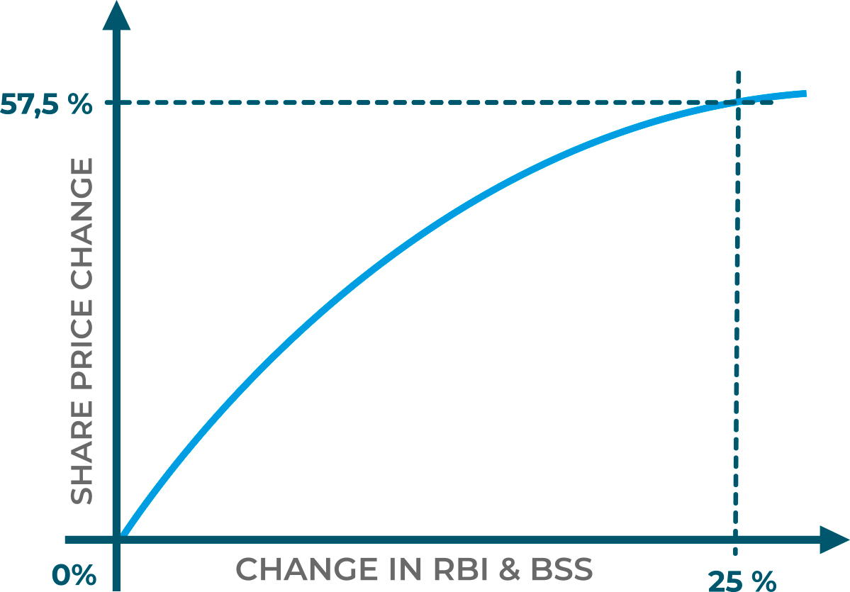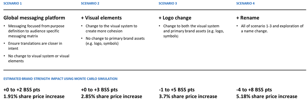 Con estos datos y apalancándonos, de nuevo, en el modelo de evaluación propuesto, se podrían vincular los cambios con incrementos concretos en la Fuerza de Marca y en el precio de las acciones, tal y como muestra la siguiente tabla: